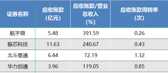 应收账款周转率是衡量企业应收账款变现速度和管理效率的核心财务指标,本质是“企业在一定时期内(通常为 1 年),应收账款转化为现金的平均次数”,也是企业“资金效率的晴雨表”。导航芯片企业的应收账款周转效率整体偏低。北斗星通周转率为1.32次,为所有企业中最高;其他企业均低于1,华为创通为0.85次,振芯科技为0.43次,航宇微为0.26次,资金使用效率有待提升。