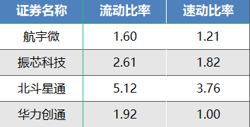 速动比率的情况也基本相当,航宇微与华力创通表现较好,分别为1.21和1.00,短期偿债能力较强;振芯科技较高,为1.82,北斗星通为3.76,显著高于合理区间,反映了资金利用效率较低的情况。