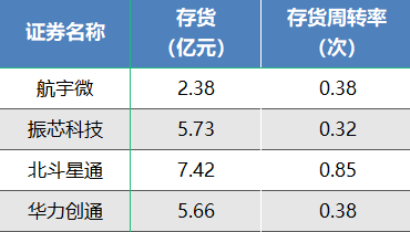 存货规模与存货周转率是衡量企业运营效率和资产流动性的核心指标,二者结合可全面反映企业存货管理能力、市场竞争力及潜在财务风险。在存货管理方面,北斗星通最高为7.42亿元;振芯科技与华力创通基本持平,分别是5.73亿元与5.66亿元;航宇微为2.38亿元。