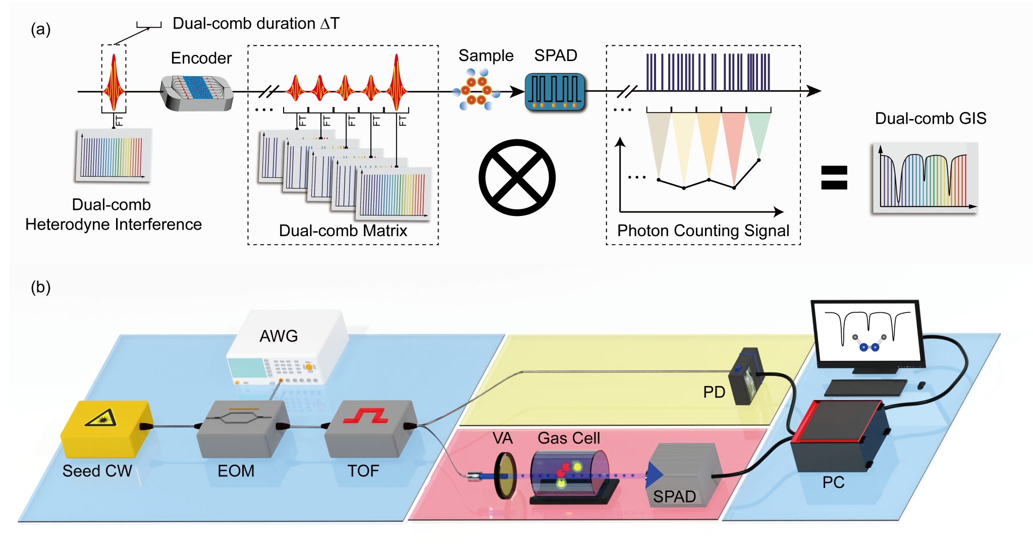 图a单光子双梳鬼成像光谱技术基本原理。图b单光子双梳鬼成像光谱实验装置图。