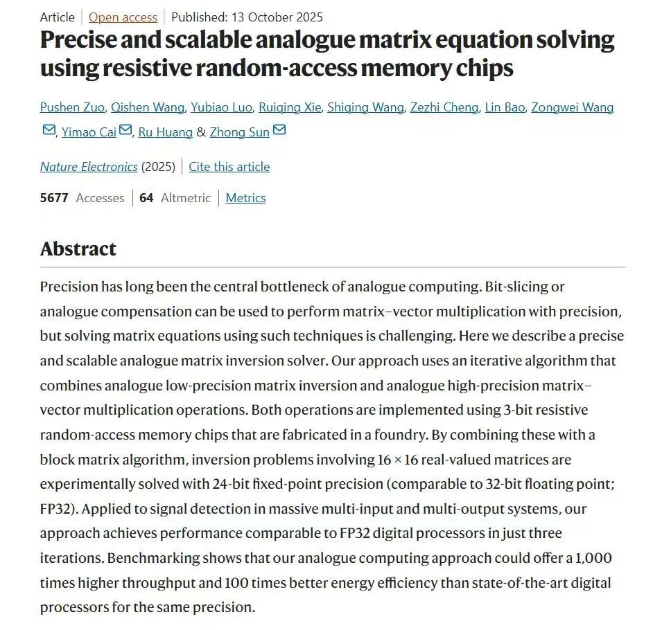 研究团队成功研制出基于阻变存储器的高精度、可扩展模拟矩阵计算芯片,首次实现了在精度上可与数字计算媲美的模拟计算系统,将传统模拟计算的精度提升了惊人的5个数量级。相关性能评估表明,该芯片在求解大规模MIMO信号检测等关键科学问题时,计算吞吐量与能效较当前顶级数字处理器(GPU)提升百倍至千倍。