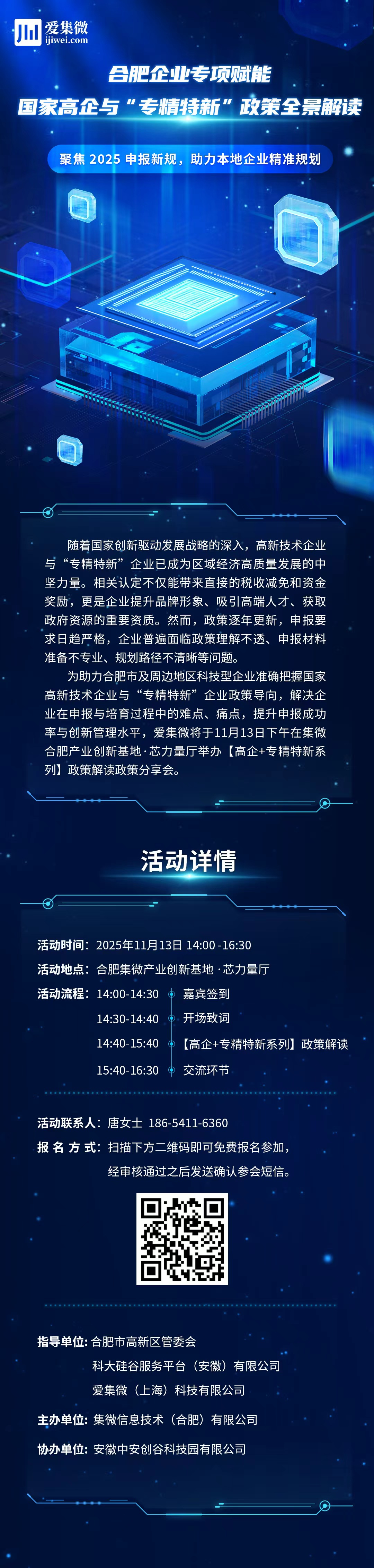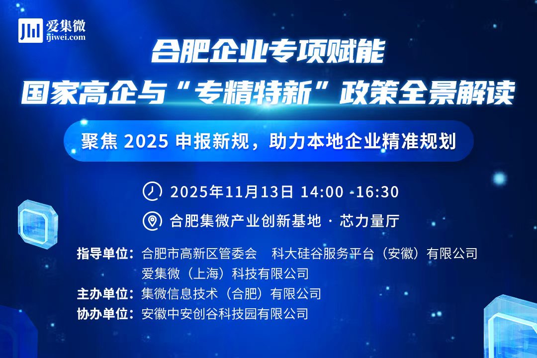 为助力合肥市及安徽省内科技型企业精准把握2025年政策风向,破解申报难题,爱集微特邀政策咨询专家,于2025年11月13日(星期四)下午在合肥集微产业创新基地举办 《【国家高企+专精特新系列】政策解读》专项培训会。本次会议旨在为本地企业提供一场关于政策红利与申报实战的“及时雨”,赋能企业在新一轮发展中乘势而上。