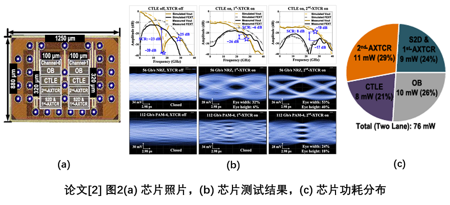 图1展示了单端多阶串扰消除接收机前端的电路架构图。图2(a),(b),(c)分别展示了提出的接收机前端芯片面积、测试结果,及其功耗分布。