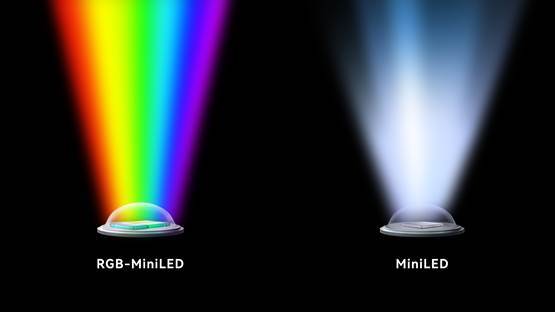 与传统 Mini LED 不同,RGB-Mini LED 并非使用单一的白光或蓝光 LED 作为背光源。它直接在背光模组中集成了红(R)、绿(G)、蓝(B)三原色的 Mini LED 芯片。
