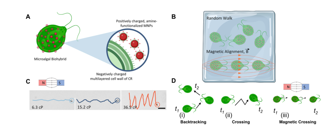 针对上述挑战,Akolpoglu等人围绕复杂生物微环境中微型机器人的稳定推进与精准导航问题,提出了一种融合生物自主运动能力与外部磁场调控的生物混合导航策略。该方法通过将天然具备鞭毛推进能力的微藻与磁性纳米颗粒相结合,在保留其内在生物运动特性的同时,引入外部磁场实现方向引导,从而实现对微型机器人运动轨迹的有效调控。
