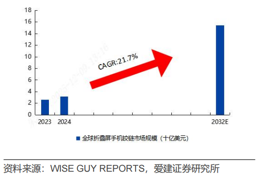 终端市场的激战,最先在供应链端掀起波澜。WISE GUY REPORTS数据显示,2024年全球折叠屏铰链市场规模达32亿美元;预计2032年将进一步增至154亿美元,2024-2032年复合增长率达21.7%。