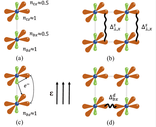 图1 施加垂直电场前后的粒子数和超导配对情况示意。(a) 无电场时粒子数情况。(b) 无电场时主要超导配对构型。(c) 有垂直电场时电子转移情况。(d) 有垂直电场时主要超导配对构型。