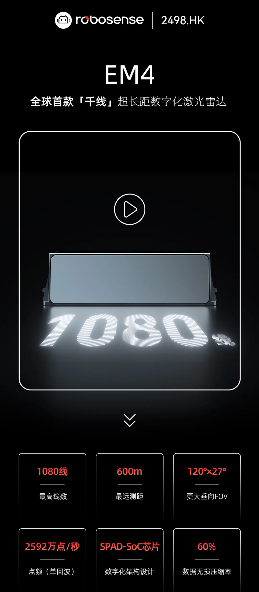 据IT之家此前报道,2025 年初推出的速腾聚创 EM4 是全球首款 1080 线激光雷达,最远测距 600m、垂向 FOV 120°×27°、点频 2592 万点 / 秒,可更清晰地探测到 600m 内白色车辆、300m 内交通锥桶、180m 内轮胎,并由此提高车辆紧急避让或刹停的最高时速。