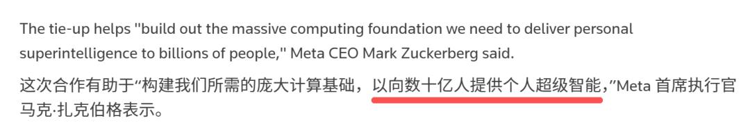 扎克伯格更是亲自在声明中撂下狠话:这次合作将帮助我们建设大规模计算基础设施,为数十亿人提供个人超级智能!
