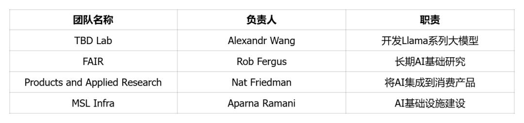 2025年8月,Meta Superintelligence Labs进一步重组为四个子团队: