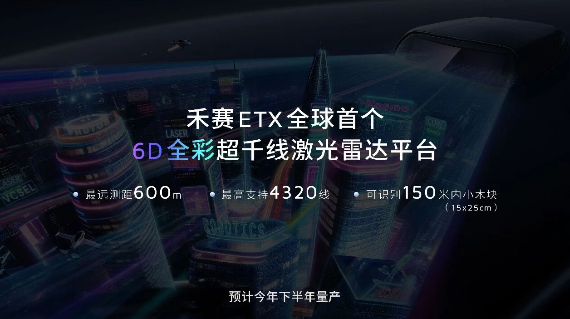 禾赛宣布,ETX 系列激光雷达将搭载毕加索 SPAD-SoC 全新升级,量产版 ETX 系列激光雷达具有更灵活的功能配置,可支持 1080 线、2160 线、4320 线等多种高线数方案。ETX 预计今年下半年量产交付,并计划于 2027-2028 年广泛搭载于多款旗舰车型上。