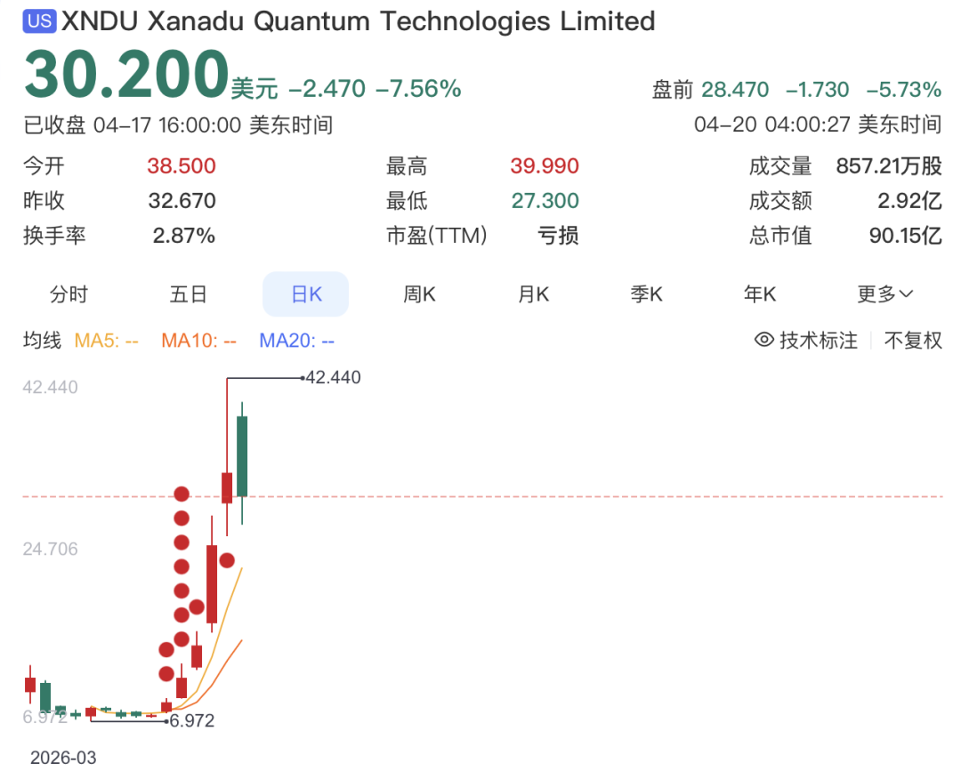 Xanadu上市后,股价经历了约10天的震荡,随后开启快速上涨之旅,最高峰股价突破40美元,相比上市大涨500%,市值高达126亿美元。昨天“暂停”后,最新市值为90亿美元。