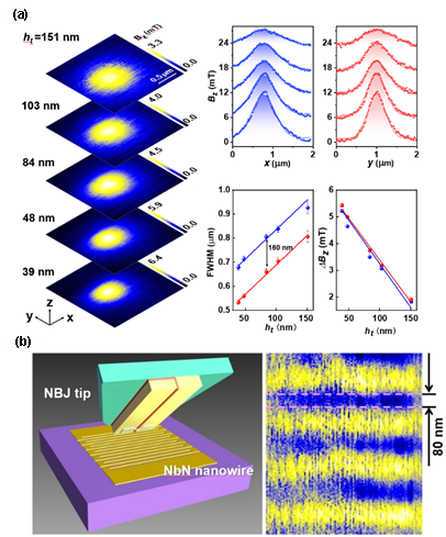 磁场是基础物理性质之一,实现对它的高分辨率成像,对于探索量子材料和器件具有重要意义。传统扫描SQUID显微镜虽磁场灵敏度极高,但其空间分辨率受器件结构限制,难以进一步提升。为突破这一瓶颈,超导电子实验室研究团队创新利用高质量超导NbN薄膜,成功制备出基于单个“纳米桥结”的磁探针。NbN材料具备高临界温度和强抗磁性能,其薄膜质量直接影响探针器件的性能。通过精密调控薄膜生长和微纳加工条件,团队将NbN桥结区域厚度降低20纳米以下,使其具备量子级别的磁场响应特性,同时本征磁场噪声低至100 nT/√Hz。实验证明,该探针不仅能清晰观测到铌薄膜中单个磁通量子涡旋,还可分辨间距仅80纳米的超导纳米线结构,展现出卓越的磁场灵敏度与空间分辨能力。