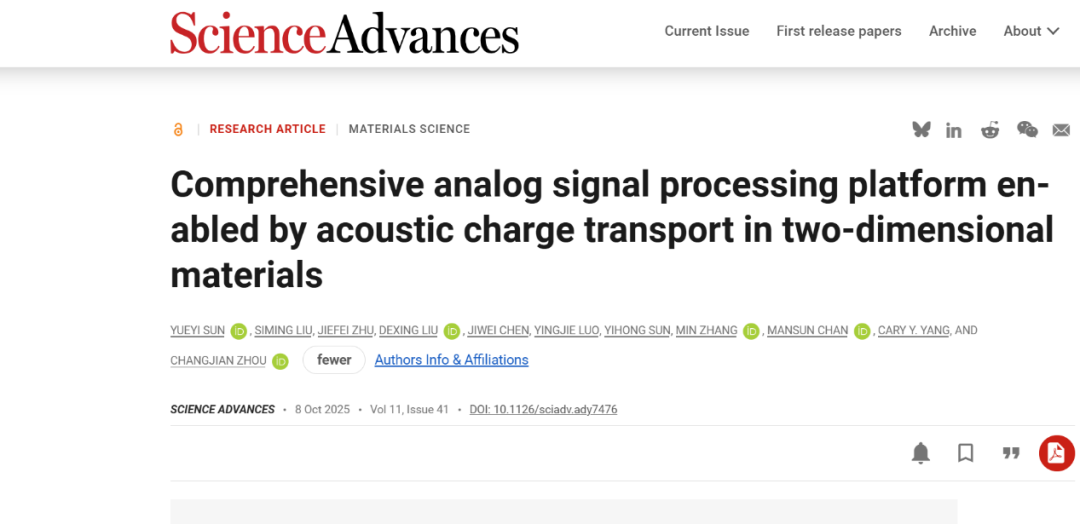 近日,华南理工大学周长见副教授以唯一通讯作者的身份,在Science Advances期刊上发表了《Comprehensive analog signal processing platform enabled by acoustic charge transport in two-dimensional materials》论文,论文第一完成单位为华南理工大学微电子学院,我院2022级博士生孙悦怡为论文第一作者。该工作得到了香港科技大学Mansun Chan教授、香港中文大学(深圳)张敏教授和美国Santa Clara大学Cary Y. Yang教授的参与和帮助,相关器件制备和测试实验得到了华南理工大学微纳电子平台(Micro & Nano Electronics Platform , MNEP)of SCUT的支持。