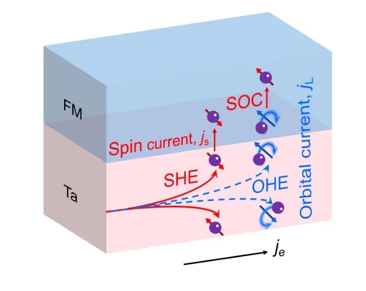 图1. 产生自旋轨道矩的自旋流可能来源:自旋霍尔效应产生的自旋流和轨道霍尔效应产生的非局域轨道流