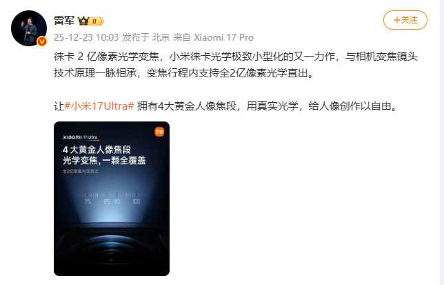 凤凰网科技讯 12月23日,小米创始人雷军于12月23日通过微博宣布,即将推出的小米17 Ultra将首发搭载“徕卡2亿像素光学变焦”镜头。他称此为“小米徕卡光学极致小型化的又一力作”,并指出其技术原理与相机变焦镜头一脉相承。