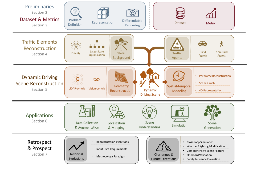 尽管相关研究呈指数增长,但现有综述往往局限于单一技术路线(仅探讨NeRF或3DGS),或脱离自动驾驶的具体语境(如多聚焦于室内小物体重建)。自动驾驶场景具有其独特性与复杂性:涵盖大规模无界场景、极度稀疏的传感器视角、以及包含大量高速运动的刚性或非刚性交通参与者。当前文献尚缺乏一项从自动驾驶真实需求出发,梳理从静态背景到动态场景,再到下游应用(如感知增强、闭环仿真、世界模型)的系统性研究。行业亟需一份能够衔接前沿图形学技术与自动驾驶工程实践的综合指南。
