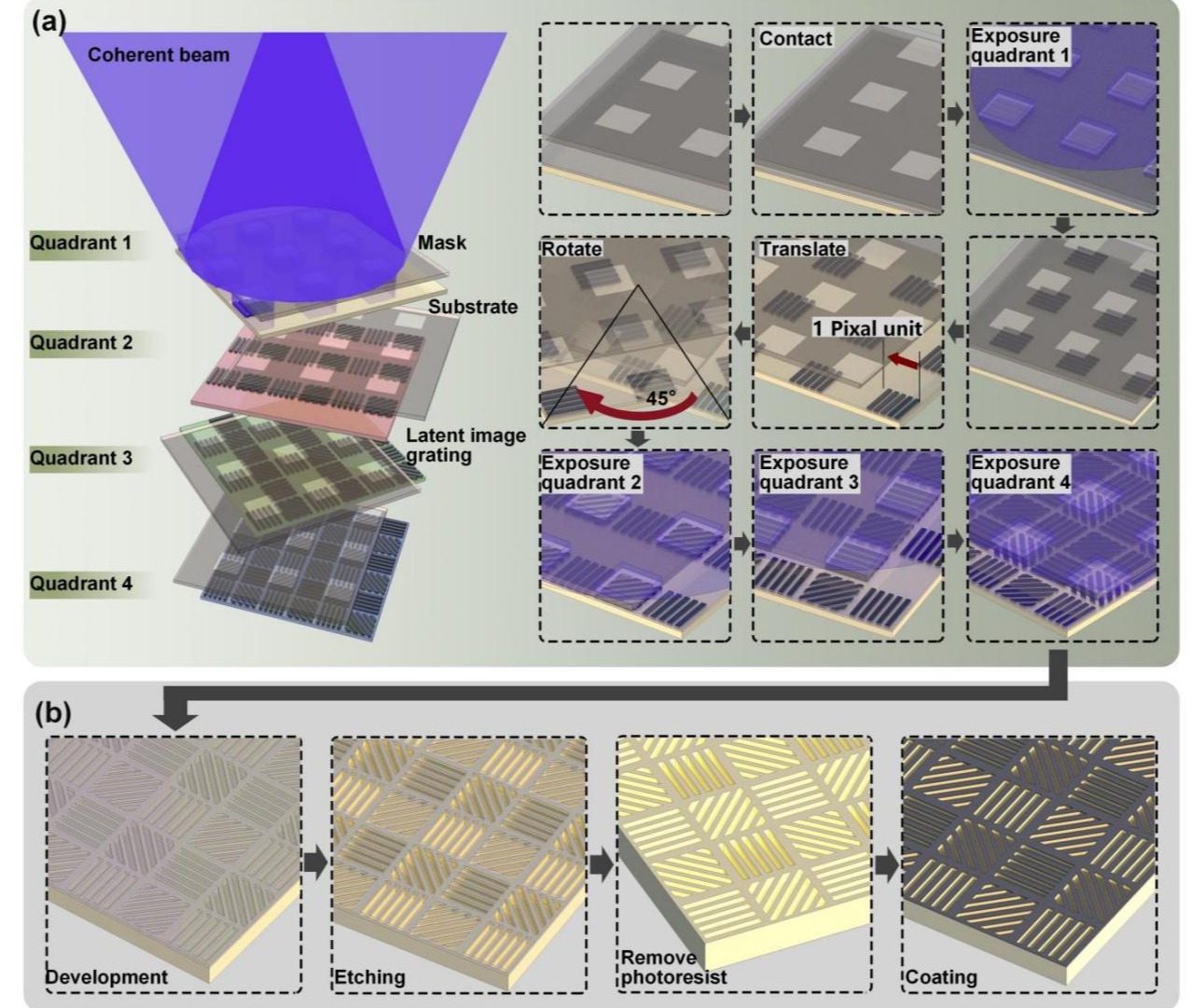 分焦平面阵列因具备高集成度、高鲁棒性和高动态适应性等优势,在偏振成像领域受到广泛关注。制造分焦平面阵列的关键在于制备阵列化的各向异性亚波长光栅。近日,清华大学深圳国际研究生院李星辉副教授团队在分焦面超像素阵列光刻制造领域取得新进展,为中红外偏振成像系统的关键器件制备提供了新方案。
