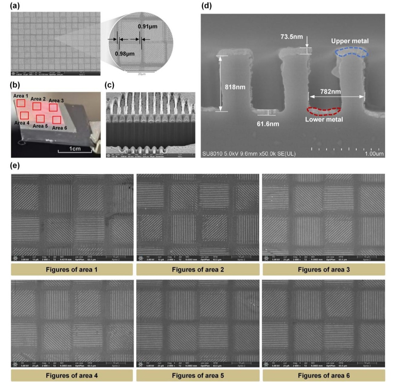 研究团队使用有限差分时域,分析模拟了间隙大小及间隙填充介质对干涉条纹的作用,选用折射率匹配材料对间隙进行填充,抑制掩膜与基底间隙造成的干涉条纹质量下降。同时,团队构建了基于显微成像技术的亚微米级精度对准观察平台,使用掩膜板上的双区域周期性条纹标记,实现掩膜与基底顶点的对准,成功实现了分步光刻套刻对准,避免了不同线栅区域的串扰。