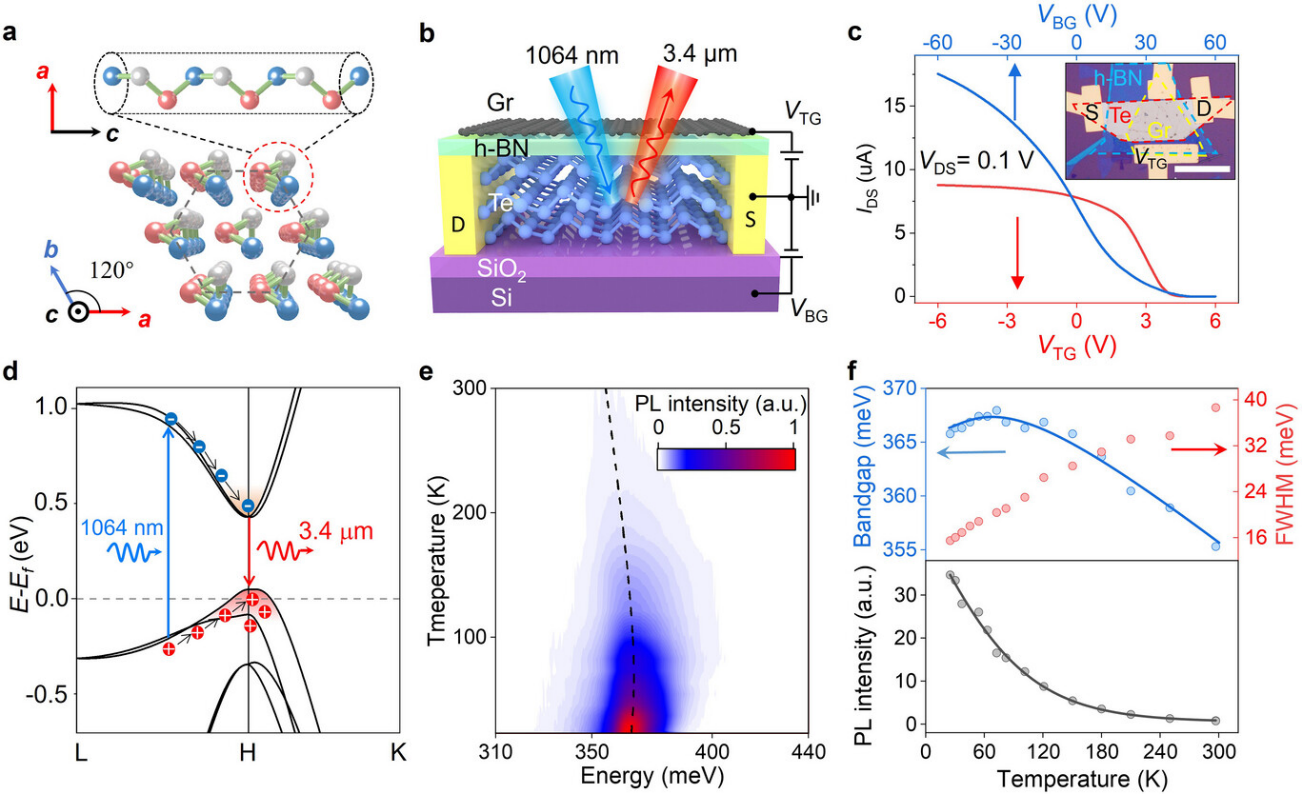 电子芯片与光子芯片的集成依赖于与片上互连兼容的高效光源和调制器。中红外波段(约3—12μm)在大气窗口传输、分子指纹识别和化学传感等领域具有重要应用价值。然而,现有的窄带隙半导体(如InAs、HgCdTe)面临制备成本高、与片上集成兼容性差等挑战。作为极具潜力的二维中红外材料,黑磷(BP)虽备受关注,但其环境不稳定性以及栅压调控下不稳定的发光波长限制了其实际应用。相比之下,元素半导体Te具有窄带隙(~0.36eV)、高环境稳定性及独特的螺旋链状晶体结构,是构建下一代中红外光电器件的理想候选材料。