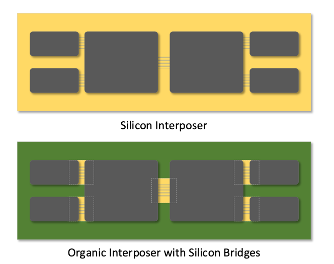 图1:中介层与桥接层。中介层是大型硅平台,而桥接层是嵌入有机中介层或衬底中的小型硅片。来源:Bryon Moyer/Semiconductor Engineering