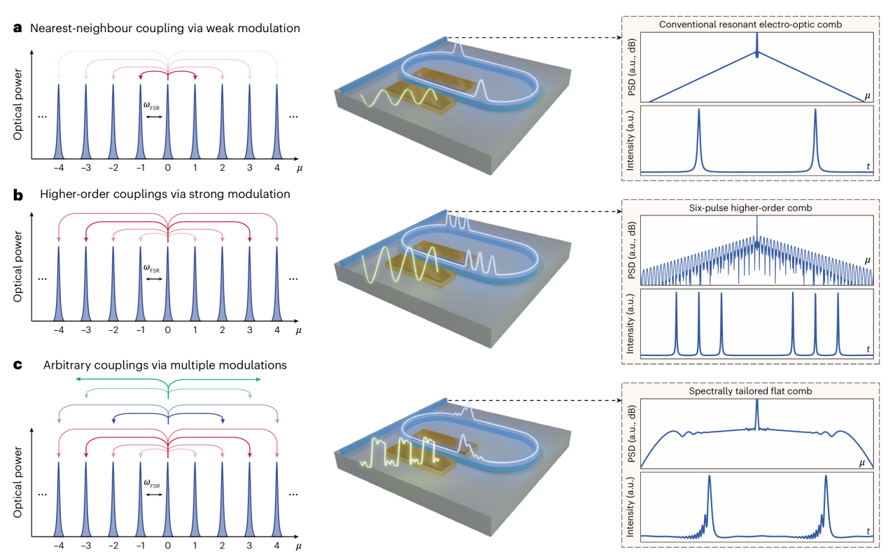 2026年3月12日,北京大学物理学院现代光学研究所胡耀文研究员、龚旗煌教授团队与哈佛大学Marko Loncar教授团队合作,在国际学术期刊《自然·物理学》(Nature Physics)上在线发表一项以《强耦合电光频率梳:通用动力学与可编程微波调控》(“Universal dynamics and microwave control of programmable resonant electro-optic frequency combs”)为题的突破性研究成果。该研究依托薄膜铌酸锂(TFLN)平台,国际首次实验观测强耦合电光频率梳,完整揭示其普适动力学,并实现微波驱动片上可编程的光频梳调控,标志着谐振型电光频率梳从“固定功能光源”迈向“全可编程光子平台”新时代。