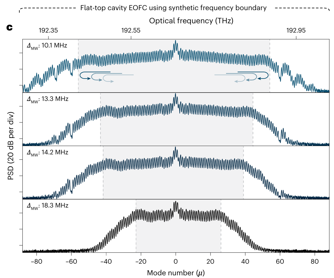 引入多音微波驱动后,谐振电光梳进一步展现出其可编程能力:通过改变微波频率与FSR的倍频关系,同一TFLN谐振腔即可输出梳齿间隔不同的宽带频率梳,实现重复频率灵活调节;在总微波功率不变的情况下,多音驱动还能显著改善梳带宽与光谱形状,通过引入失谐构造“频率边界”,团队实现了100余个模式的谐振平顶电光梳,并将对光学腔品质因子的要求降低了8倍。这表明,电子驱动本身也可以成为高自由度的频谱整形工具,使谐振电光系统由固定功能器件迈向可重构、可编程的片上光子平台,在通信、计量、微波光子学与任意波形生成等方向展现出广阔应用前景。