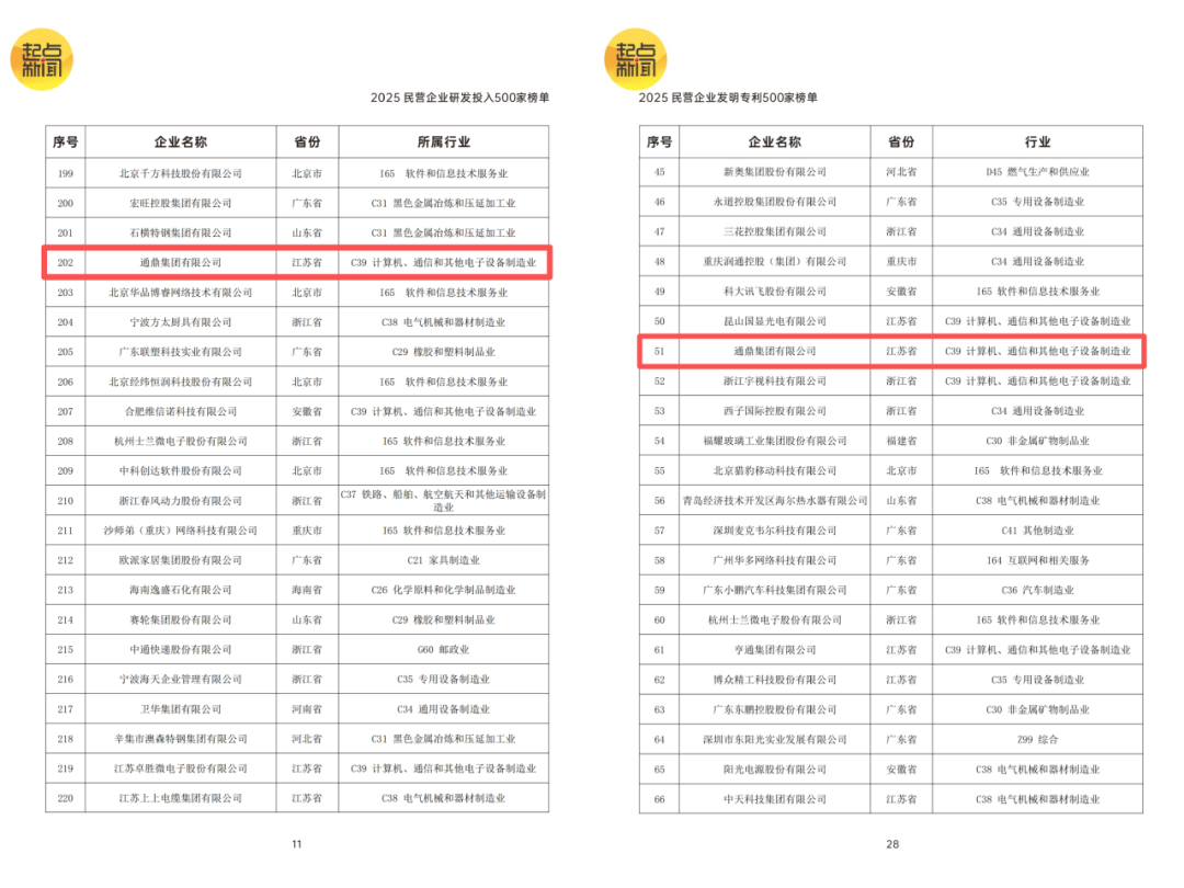 通鼎集团凭借持续的研发投入和突出的创新能力,成功入选《2025民营企业研发投入500家榜单》第202位、《2025民营企业发明专利500家榜单》第51位。