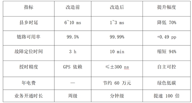 单站改造费用:卫星模块更换≈1200元,1588v2地面链路≈120元,降低90%。全省4.8万座4G基站测算,可节约投资7467万元,工期缩短60%。