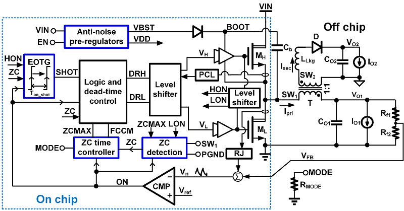 Fly-buck转换器能够以较低成本实现一个非隔离输出与多个隔离输出,广泛应用于工业电源、两轮电动车BMS保护板等场景。然而,传统架构为保证隔离侧负载能力,需工作在强制连续导通模式(FCCM)下,即使在轻载条件下仍需保持高开关频率,导致开关损耗大、效率降低。为此,研究团队在论文[1]中提出了一种创新的限制零电流时间的断续导通模式,并结合具有隔离侧输出隐性反馈机制的增强型导通时间发生器,在轻载时显著降低开关频率,提升能效,同时保障了隔离侧负载能力。