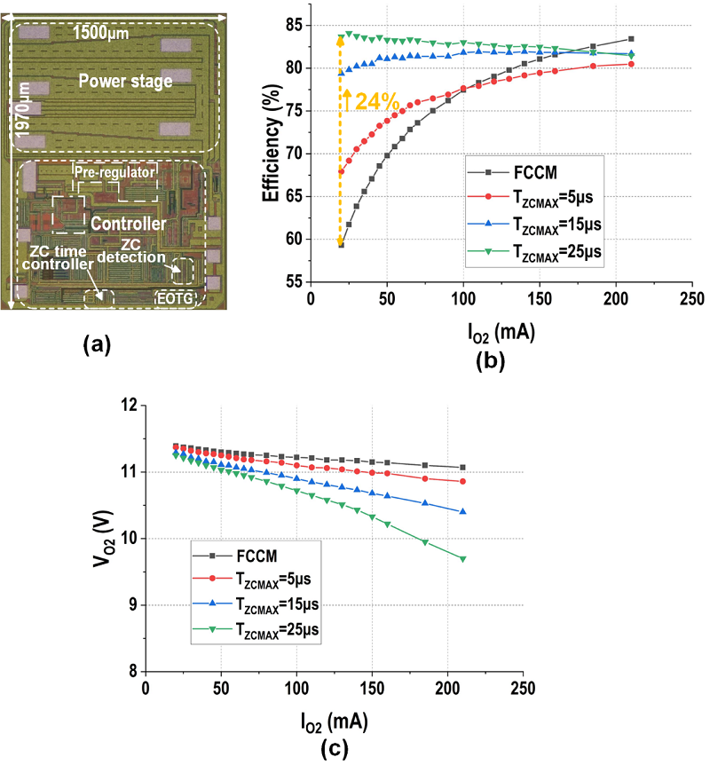 图 3  (a) 芯片照片;(b) 测试得到的不同零电流时间限制下的转换效率;(c) 测试得到的不同零电流时间限制下的隔离侧输出电压