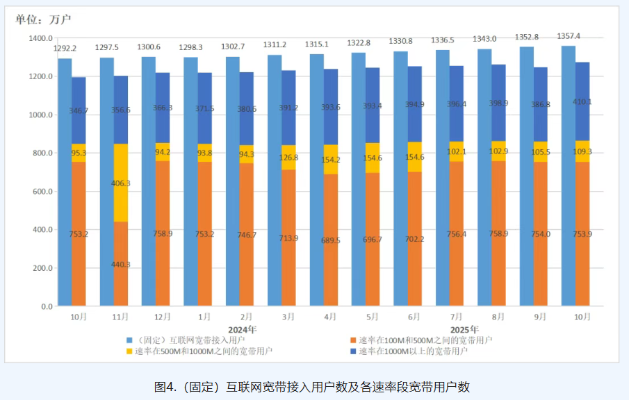 在固定宽带接入用户方面,截至10月末,上海市各基础电信企业固定互联网宽带接入用户总数达1357.4万户,同比增长5.0%;其中,光纤接入(FTTH/O)用户1301.2万户,占固定互联网宽带接入用户总数的95.9%;1000Mbps及以上接入速率的固定互联网宽带接入用户为410.1万户,占总用户数的比重为30.2%;2000Mbps及以上接入速率的固定互联网宽带接入用户为24.6万户。