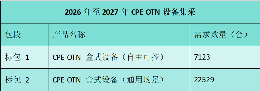 C114讯 4月2日消息(九九)中国移动采购与招标网日前发布2026年至2027年CPE OTN设备集中采购项目招标公告,本期集中采购产品为CPE OTN设备,预估采购规模共计29652台,其中CPE OTN设备(自主可控)7123台,CPE OTN设备(通用场景)22529台。