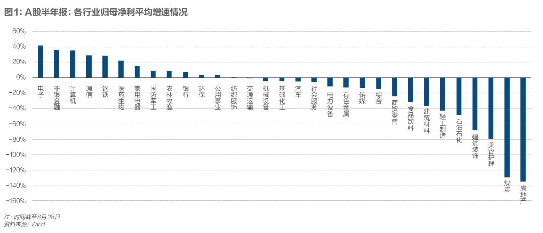 从截至8月28日已披露的A股中报业绩来看,这种结构性突破的现象也非常明显。电子行业以41.76%的归母净利平均增速排在31个申万一级行业第一,电子行业市值也一度超过银行业位居A股第一,此外计算机、通信、医药生物等科创行业盈利增速也居前,平均盈利增速分别为35.39%、28.91%、22.13%。而房地产、建筑、食品饮料等旧经济动能的传统行业盈利增速普遍不佳,行业平均盈利增速普遍下滑两位数以上。