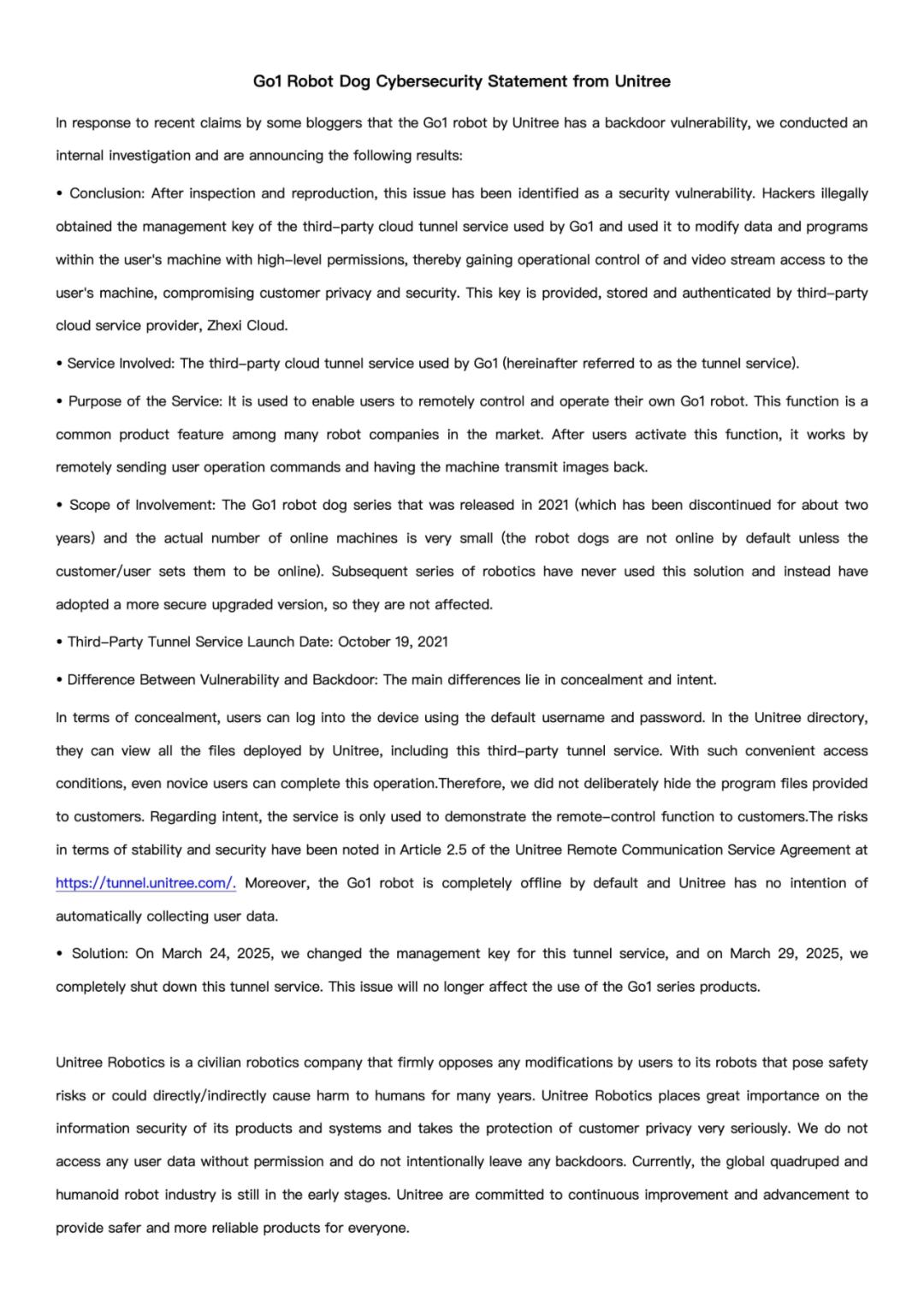 针对此类漏洞,宇树科技已在 2025 年 3 月 24 日更换了该隧道服务的管理密钥,并在 3 月 29 日彻底关闭了该隧道服务。此问题将不再影响 Go1 系列产品的使用。