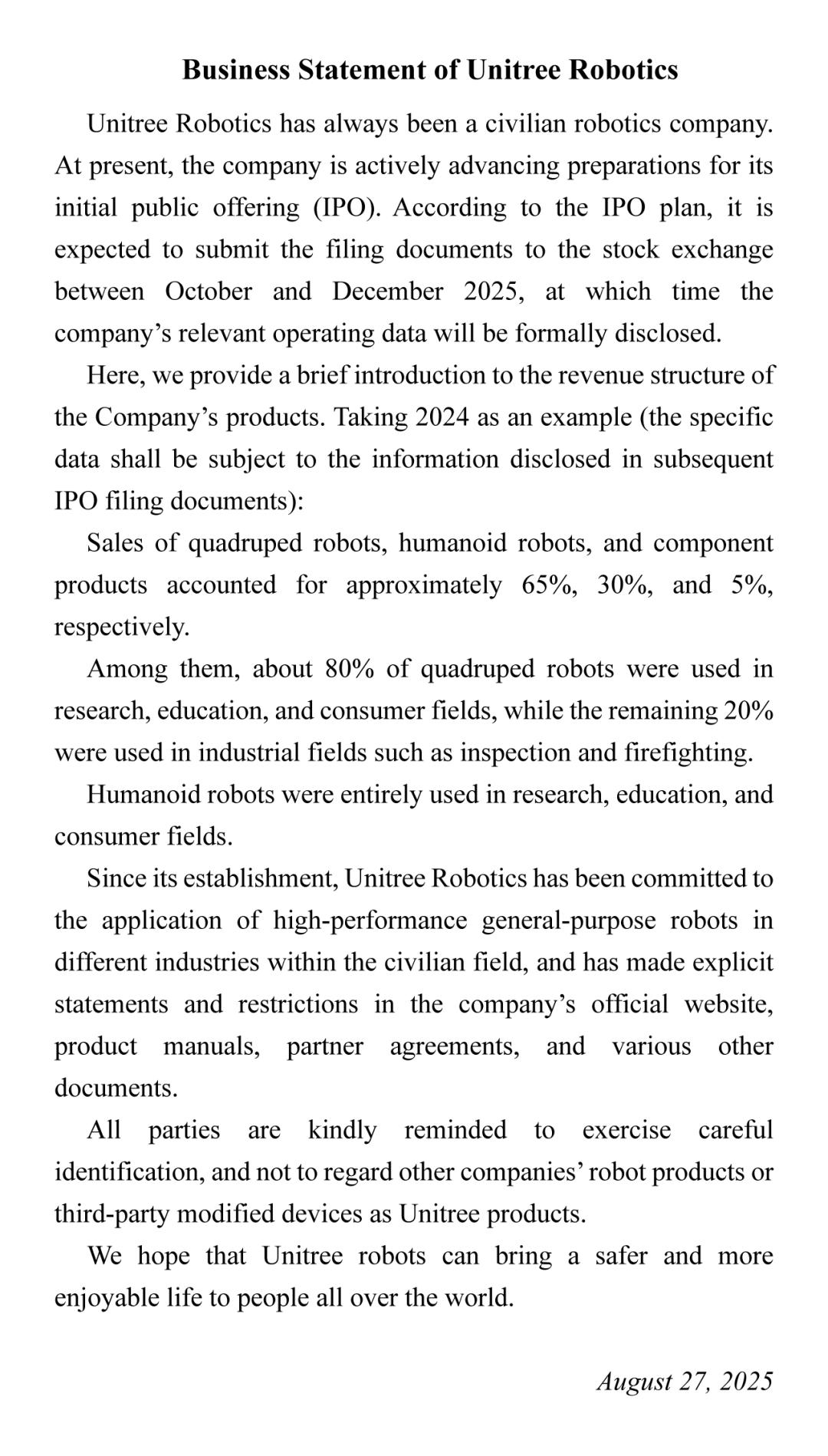 宇树科技自成立以来一直是一家「民用机器人公司」。目前,公司正在积极推进首次公开募股(IPO)的准备工作。根据 IPO 计划,公司预计将在 2025 年 10 月至 12 月期间向证券交易所提交备案文件,届时公司的相关经营数据将会正式披露。