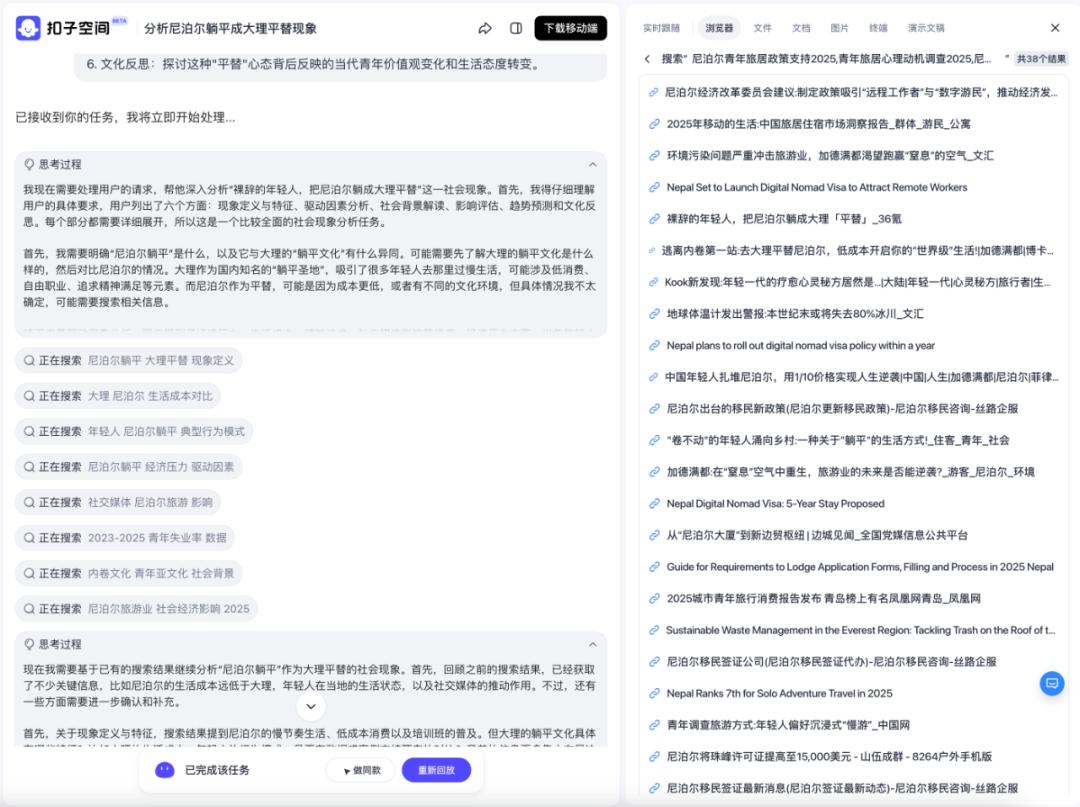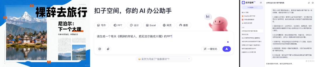 我们模拟了一个场景,要求扣子空间根据我们最近的一篇文章《裸辞的年轻人,把尼泊尔躺成大理》,生成一份PPT。