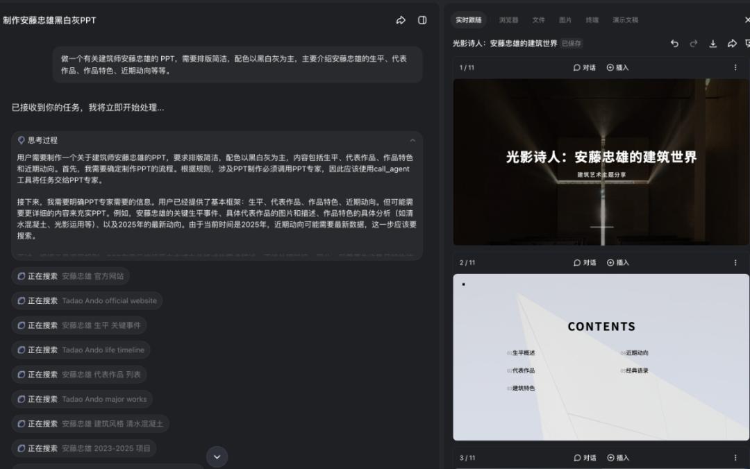 而在制作PPT这类复杂任务中,它还会在关键节点停下来,让你确认大纲、选择风格——能做选择题,就不做填空题。