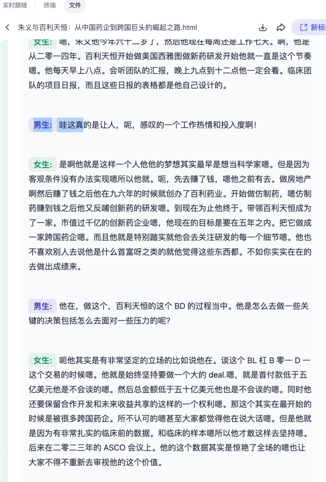 然后,扣子空间就根据播客的特点,去除原文中的图片等元素,并且对原文进行压缩,调整为两个人对话的版本。