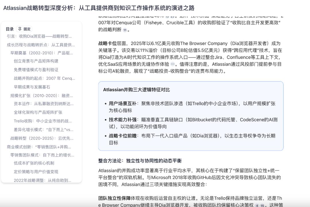 以前两天的一则重要新闻为例——To B软件巨头Atlassian以6.1亿美元收购浏览器服务商The Browser Company,让扣子空间写作一篇深度文章,复盘Atlassian的成长之路。