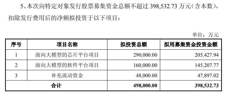 寒武纪方面表示,募集资金将主要用于三方面:约20.54亿元投向“面向大模型的芯片平台项目”,约14.52亿元投向“面向大模型的软件平台项目”,另有4.79亿元用于补充流动资金。