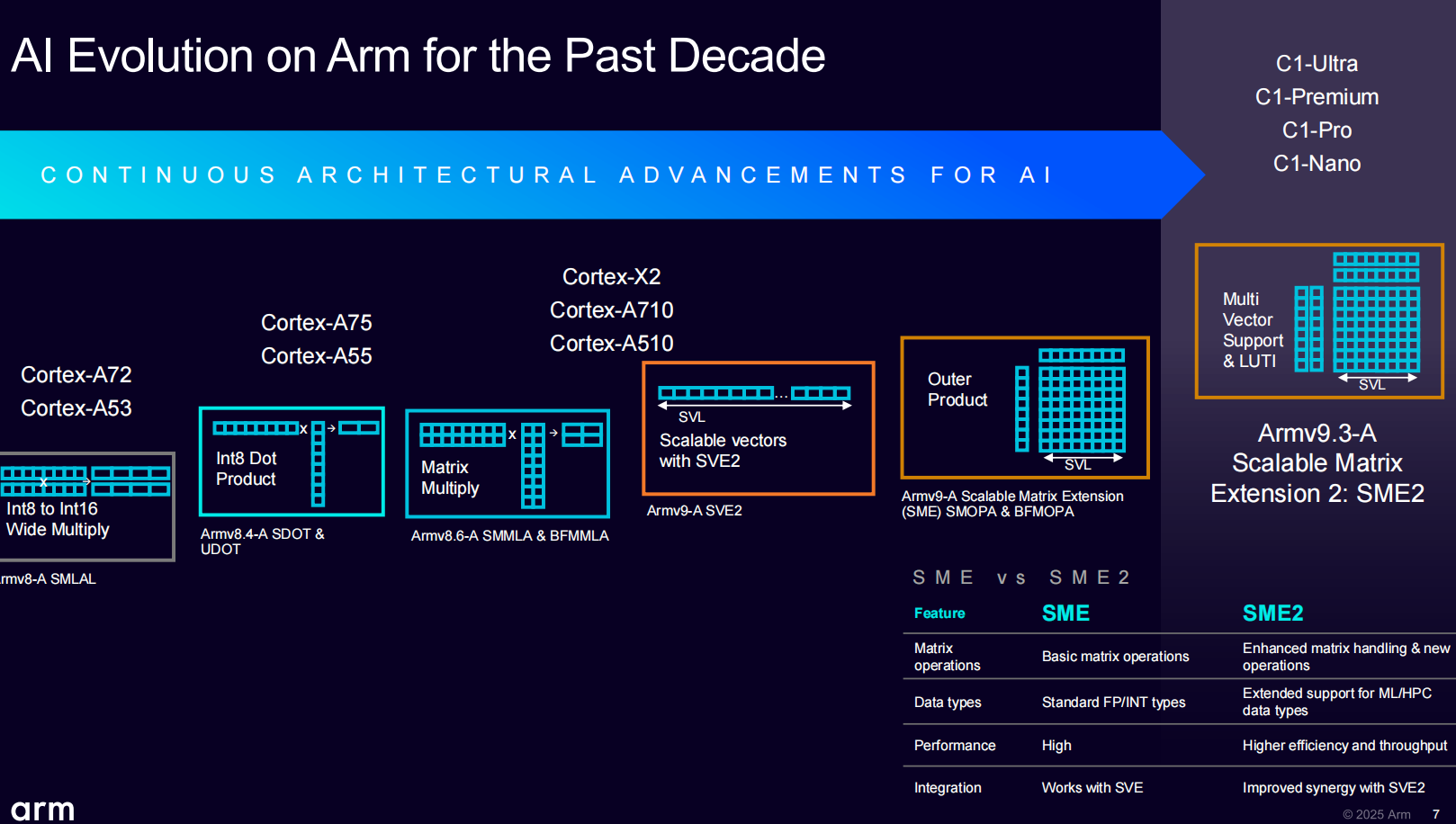 值得指出的是,此次新发布的C1 CPU系列通过 Armv9.3 架构直接内建第二代 Arm 可伸缩矩阵扩展 (SME2),显著提升了CPU的AI能力,为加速端侧AI体验带来了革命性突破。苹果去年发布的A18 Pro 芯片中首次采用SME,过去一年,SME一直是果系产品的专属,而此次Arm将升级后的SME2注入Armv9 架构,则填补了安卓阵营在该技术能力上的空白,这也为后续的旗舰手机性能竞争增添了更多看点。