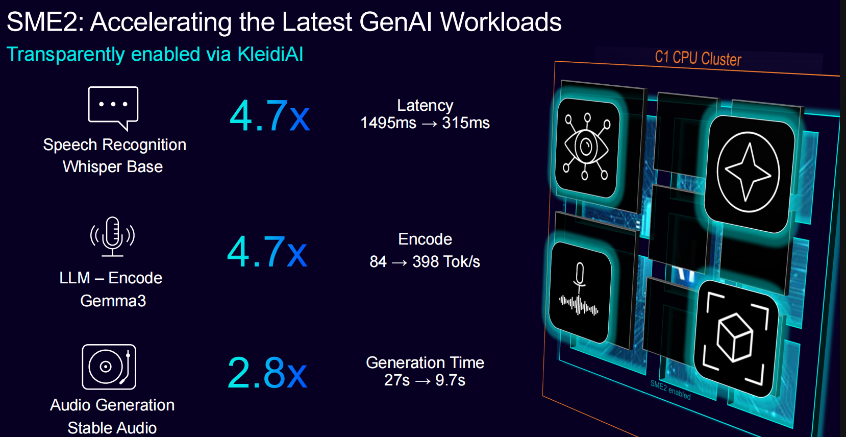 第三,SME2在CPU上非常擅长处理的一种负载形式,是包括机器学习等对于延迟要求非常高的AI诉求场景。由于SME2本身集成于CPU中,无需将数据推送到其他地方处理,使得其具有极高的响应速度,非常适合目前端侧AI的需求。