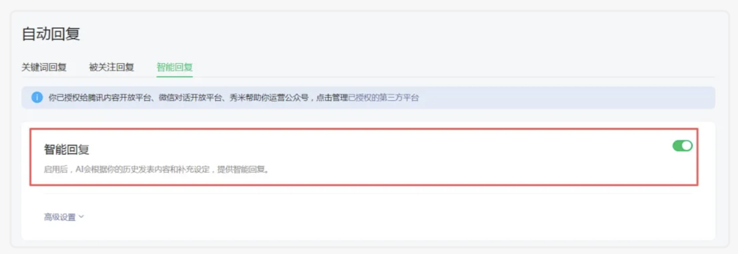 IT之家 9 月 11 日消息,据“微信派”公众号,微信官方宣布上线公众号“智能回复”功能,用户只需在公众号 PC 端后台“互动管理”内点击“自动回复”,即可开启“智能回复”。
