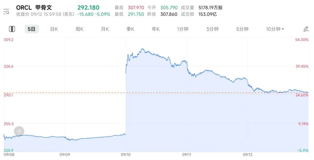 在经历了这历史性的一天后,市场情绪有所冷静。截至9月12日收盘,甲骨文股价从328.33美元的峰值回落至292美元左右,但当周涨幅仍超过27%。