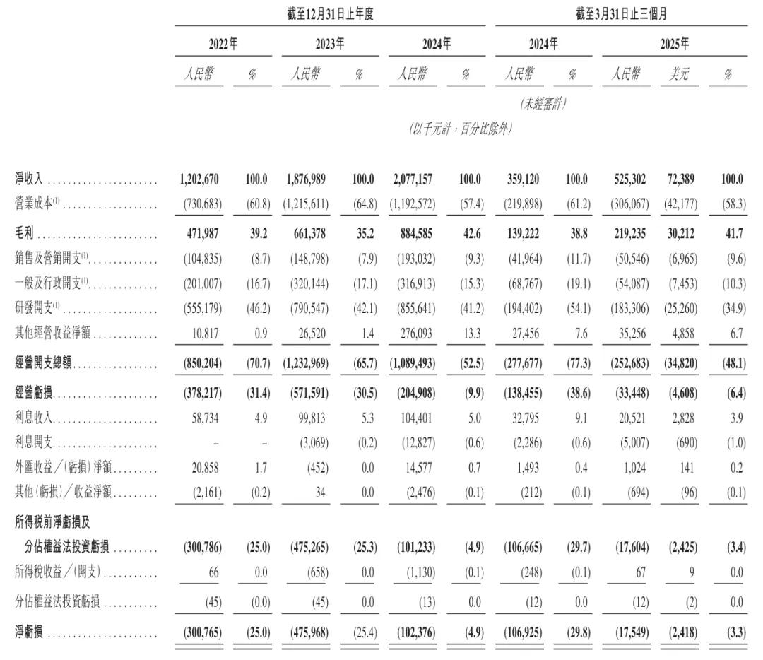 禾赛科技2022年、2023年、2024年净亏损分别为3亿元、4.76亿元、1亿元;净亏损率分别为25%、25.4%、4.9%;经调整净利分别为-1.96亿元、-2.41亿元、1369万元。