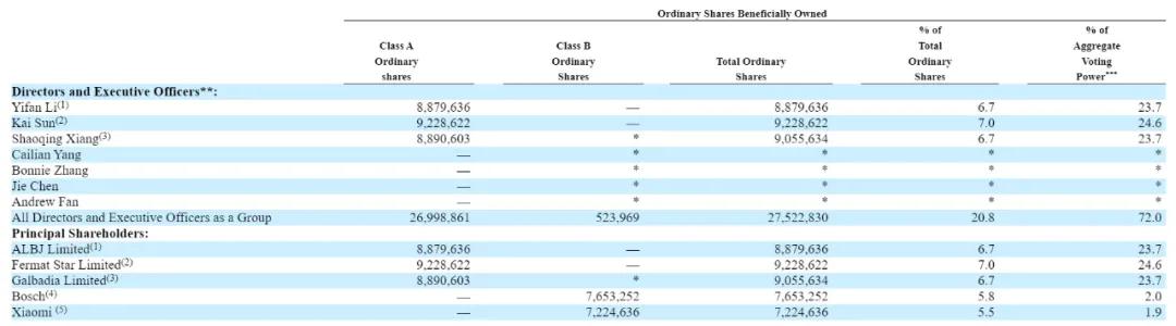 Bosch持股为5.8%,有2%投票权;小米持有为5.5%,有1.9%的投票权。