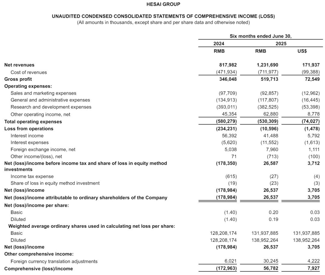 禾赛2025年上半年营收为12.32亿元(约1.72亿美元),运营亏损为1060万元,净利为2654万元。
