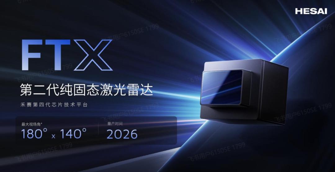 FTX是禾赛推出的第二代纯固态车规级激光雷达,采用纯固态电子扫描技术做到了水平视场最大可支持180°,垂直视场140°,其测距能力可达30米(10%反射率),点频高达49.2万点每秒。FTX还在提升性能的同时体积大幅减小,相比上一代产品重量减少了66%,通过嵌入安装,FTX外露视窗面积可减少40%,仅为50x30mm。FTX计划于2026年开始量产。