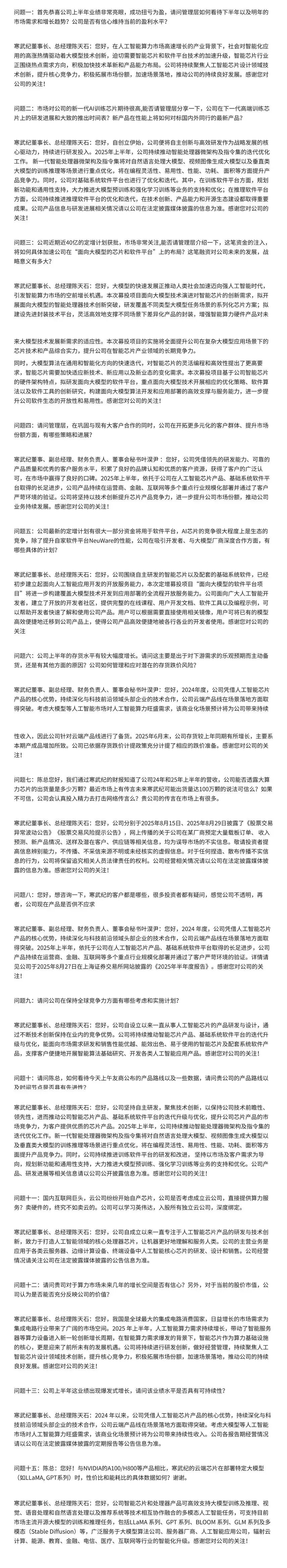 其中,在训练软件平台方面,规划新功能和通用性支持,大力推进大模型预训练和强化学习训练等业务的支持和优化;在推理软件平台方面,公司持续推进推理软件平台的优化和迭代,在技术创新、产品能力和开源生态建设都取得重要成果。公司产品信息与研发进展相关情况请以公司在法定披露媒体披露的信息为准。